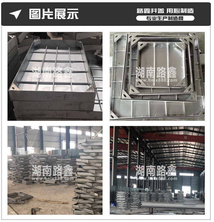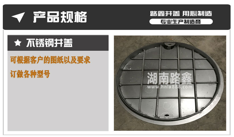 湖南路鑫交通设施有限公司是一家集研发、生产、销售以及物流配送于一体的大型建材企业,公司目前主导产品有:球墨铸铁井盖、复合树脂井盖、不锈钢井盖、公司定位于生产中高端井盖、盖板系列。产品规格全、品种多、产量大、性价比高。 我公司生产的产品-球磨铸铁井盖 , 复合井盖 , 水沟盖板,具有强度高、硬度高、承重好、抗腐蚀、抗老化、美观防盗等优点,适用于市政道路项目以及房地产项目。