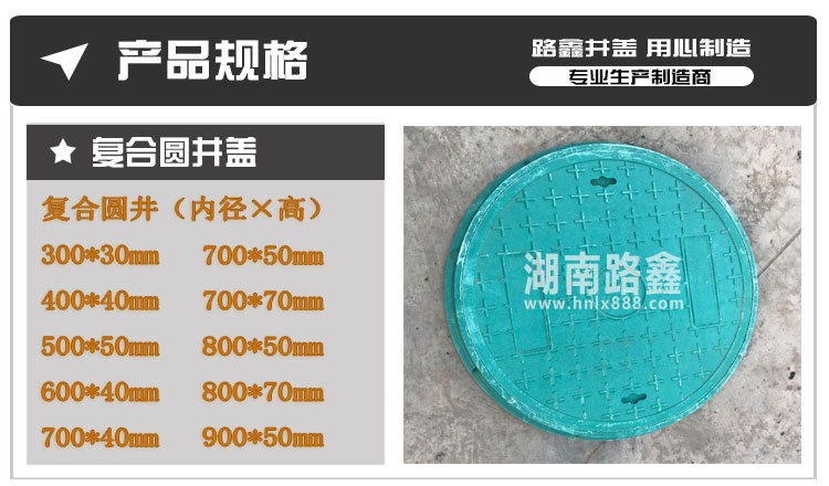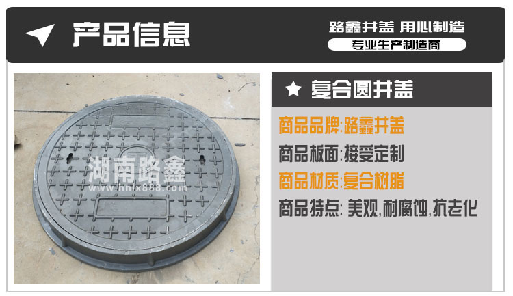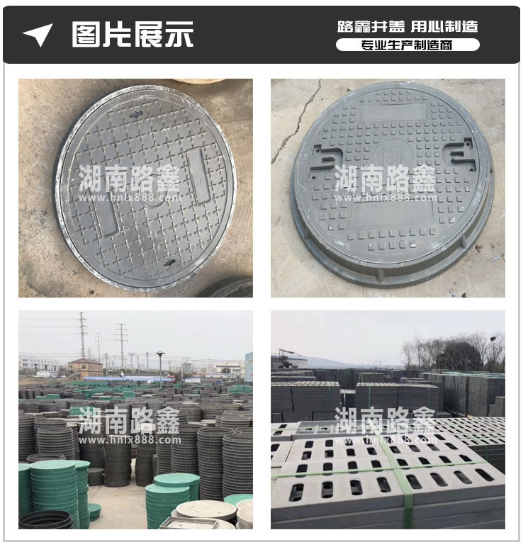 湖南路鑫交通设施有限公司是一家集研发、生产、销售以及物流配送于一体的大型建材企业,公司目前主导产品有:球墨铸铁井盖、复合树脂井盖、不锈钢井盖、公司定位于生产中高端井盖、盖板系列。产品规格全、品种多、产量大、性价比高。 我公司生产的产品-球磨铸铁井盖 , 复合井盖 , 水沟盖板,具有强度高、硬度高、承重好、抗腐蚀、抗老化、美观防盗等优点,适用于市政道路项目以及房地产项目。