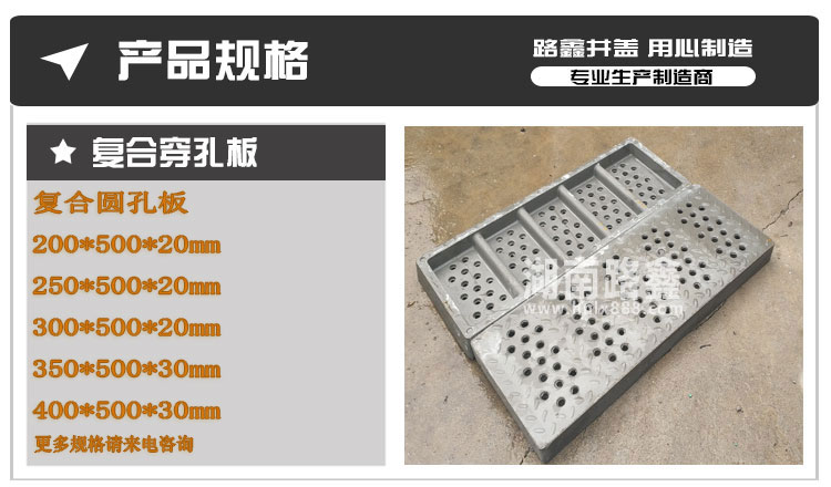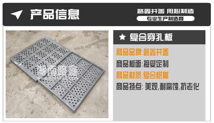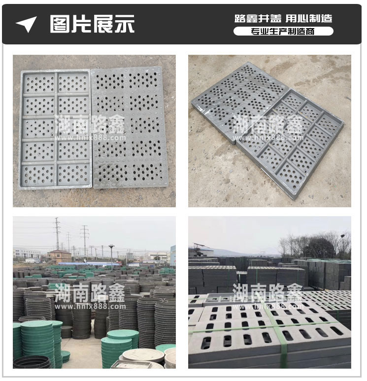 湖南路鑫交通设施有限公司是一家集研发、生产、销售以及物流配送于一体的大型建材企业,公司目前主导产品有:球墨铸铁井盖、复合树脂井盖、不锈钢井盖、公司定位于生产中高端井盖、盖板系列。产品规格全、品种多、产量大、性价比高。 我公司生产的产品-球磨铸铁井盖 , 复合井盖 , 水沟盖板,具有强度高、硬度高、承重好、抗腐蚀、抗老化、美观防盗等优点,适用于市政道路项目以及房地产项目。