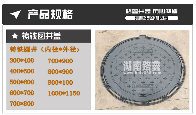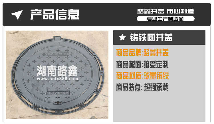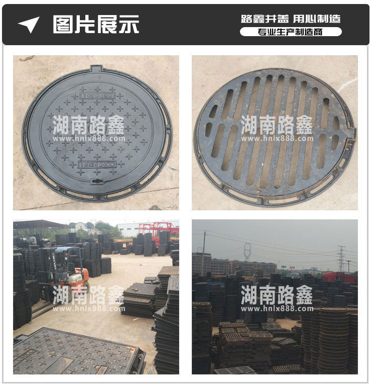 湖南路鑫交通设施有限公司是一家集研发、生产、销售以及物流配送于一体的大型建材企业,公司目前主导产品有:球墨铸铁井盖、复合树脂井盖、不锈钢井盖、公司定位于生产中高端井盖、盖板系列。产品规格全、品种多、产量大、性价比高。 我公司生产的产品-球磨铸铁井盖 , 复合井盖 , 水沟盖板,具有强度高、硬度高、承重好、抗腐蚀、抗老化、美观防盗等优点,适用于市政道路项目以及房地产项目。