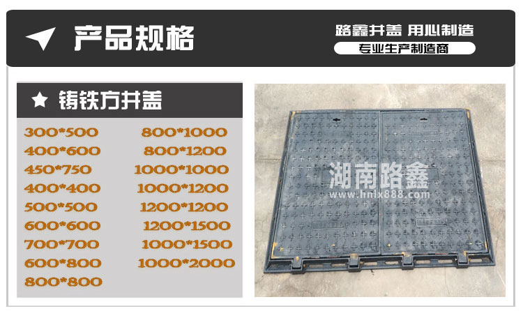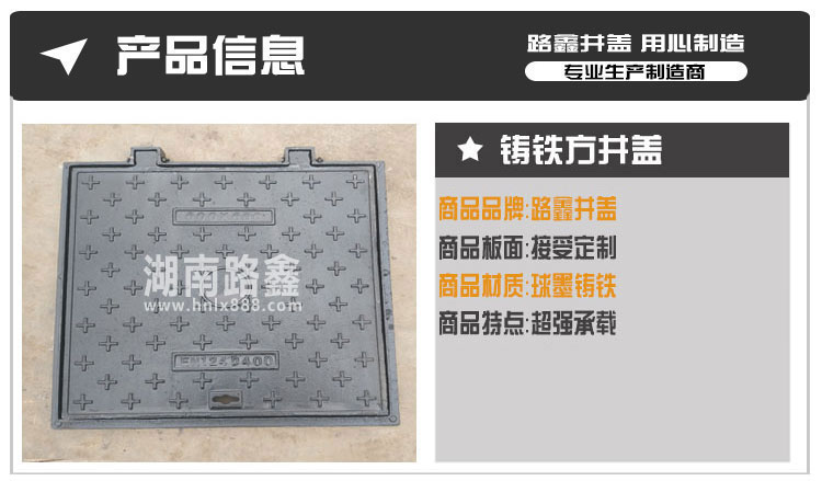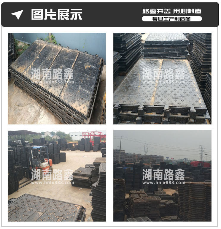 湖南路鑫交通设施有限公司是一家集研发、生产、销售以及物流配送于一体的大型建材企业,公司目前主导产品有:球墨铸铁井盖、复合树脂井盖、不锈钢井盖、公司定位于生产中高端井盖、盖板系列。产品规格全、品种多、产量大、性价比高。 我公司生产的产品-球磨铸铁井盖 , 复合井盖 , 水沟盖板,具有强度高、硬度高、承重好、抗腐蚀、抗老化、美观防盗等优点,适用于市政道路项目以及房地产项目。